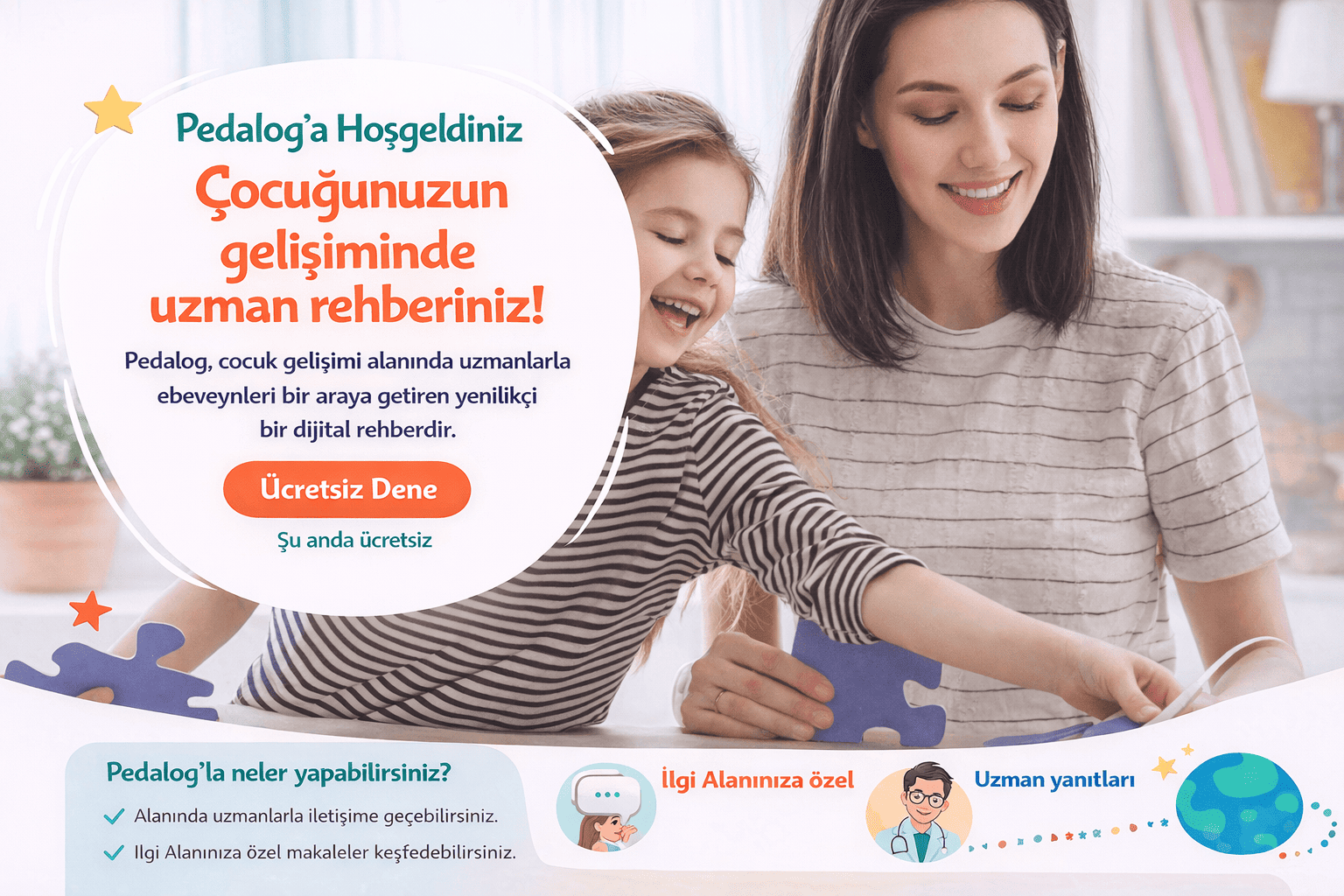 Pedalog, 0-18 yaş arası çocukların ebeveynleri için tasarlanmıştır. Bebek gelişimi, okul öncesi dönem, okul çağı ve ergenlik gibi her yaş grubuna özel gelişim içerikleri ve uzman desteği sunulmaktadır.